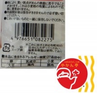 めん(小麦粉(国内製造)、卵白粉、食塩、小麦たん白)、動物油脂、しょうゆ、肉エキス、 食塩、植物油脂,砂糖、かつおエキス、醸造酢、風味調味料、かつお節粉末、煮干し粉末、昆布エキス、香辛料/調味料 (アミノ酸等)、酒精、かんすい、 着色料(カラメル、クチナシ)、増粘剤(キサンタンガム)、酸味料、(一部に卵・ 乳成分・小麦・大豆・鶏肉・豚肉を含む) |